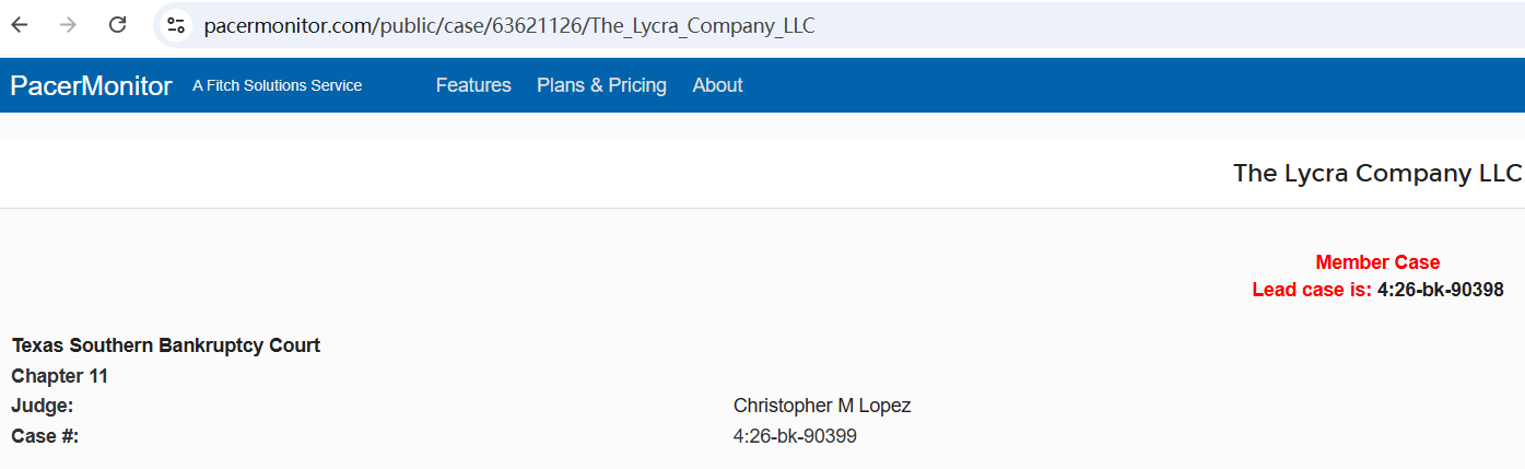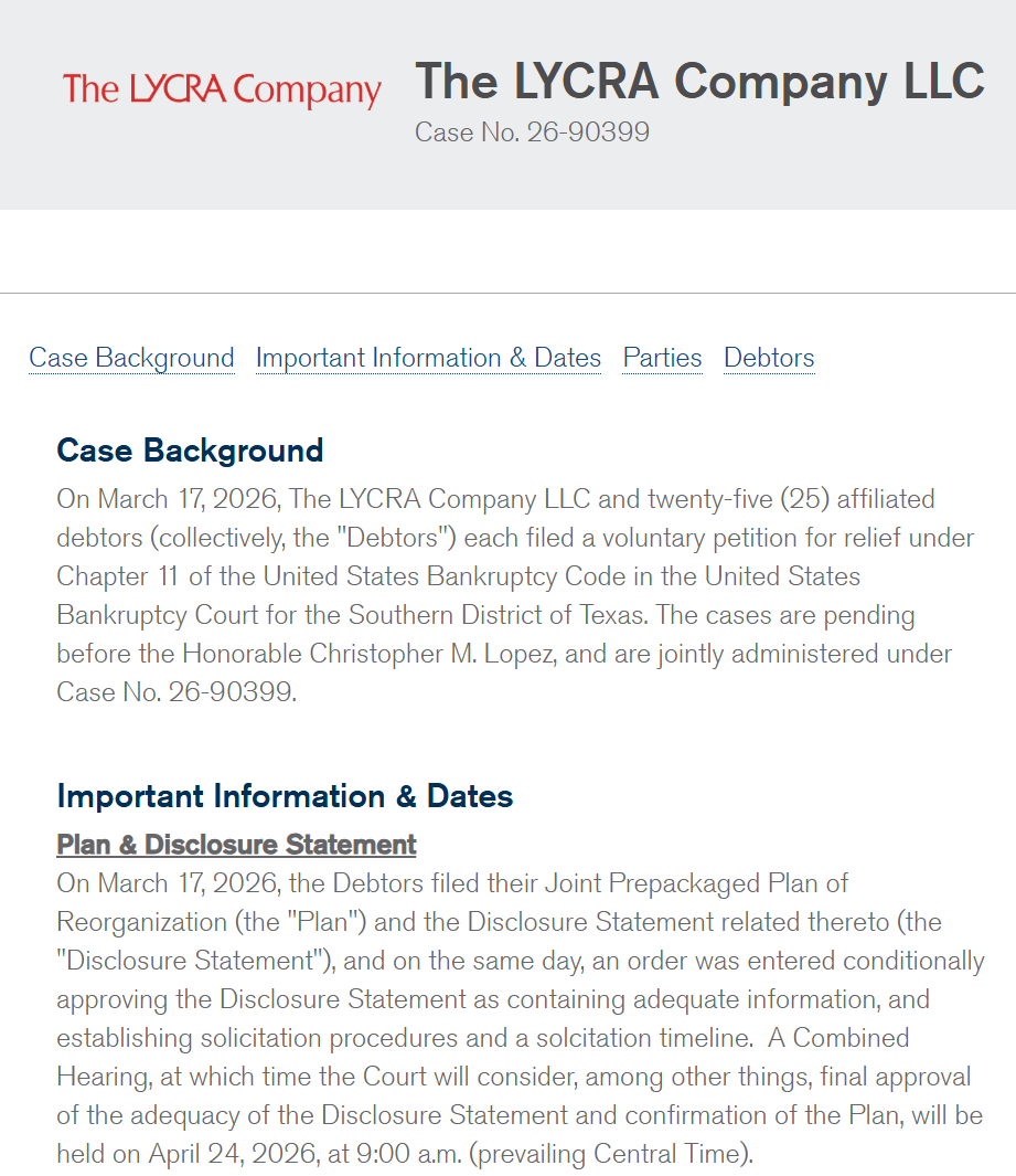 Lycra, the global spandex giant with a 68-year history, officially filed for Chapter 11 bankruptcy protection on March 17, 2026, in the U.S. Bankruptcy Court for the Southern District of Texas (Case No. 4:26-bk-90399). The cases are pending before the Honorable Christopher M. Lopez, and are jointly administered under Case No. 26-90399.